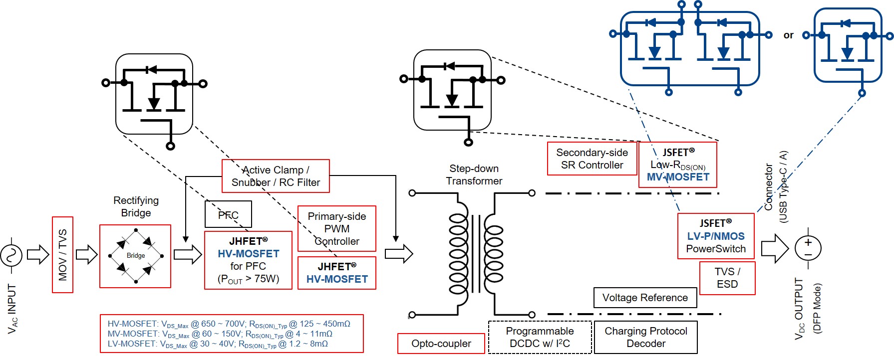 不论在原边使用的是传统的超结高压 MOSFET、或是日益受电路设计工程师及消费者追捧的氮化镓 D/E-mode HEMT,在拓扑的副边,百乐博blb微电先进 JHFET® 技术平台超结 (super-junction) 的高压 MOSFETs 在原边开关、先进 JSFET® 技术平台的中/低压 MOSFETs 在同步整流和在 USB-C® 端口电流输出开关等位置,都能提供稳定可靠而高功效的运作。 建立在 JHFET 技术平台的 650VDS_Max SJ N-MOSFETs,导通阻抗 RDS(ON) 低至 169mΩ、Qg 低至 9.7nC、Ciss 低至 333pF,所有产品均百分百通过 UIS 测试。建立在 JSFET 技术平台的 30 ~ 150 VDS_Max SGT N-MOSFETs,导通阻抗 RDS(ON) 低至 1.2mΩ、Qg 低至 7.7nC、FOM 低至 47,所有产品均百分百通过 UIS 测试。凭借极低的 Ciss、Coss、Crss、Qg、和卓越的安全操作区域 (SOA) 等,这些功率器件能更有效地解决在终端应用中存在的 软/硬开关、电感负载、EMI 等难题。能夠有如此突出的静态和动态电气特性,是因为百乐博blb微电的自有知识产权 JSFET 及 JHFET 技术平台,各项工艺参数早已跻身国际一流水平。