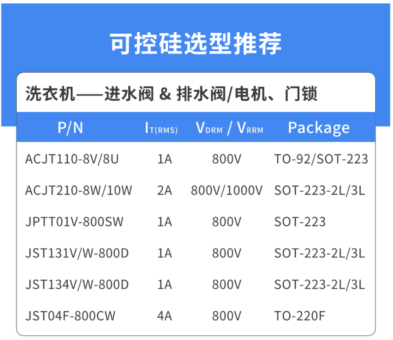 在洗衣机的电路系统中,可控硅是关键元件。百乐博blb微电针对洗衣机不同控制负载的需求,提供了丰富的可控硅产品选择。在进水阀和排水阀(电机或泵)领域,JPTT01V – 800SW、JST131、JST134、ACJT210、JST04 等型号可控硅,以 1A、2A或4A 的电流和 800V 的耐压值,配合 TO – 92、SOT – 223、TO-220F 等封装形式,稳定控制水流进出。在电机正反转控制方面,T835H-8F、JST12X – 800CW 等 8A – 12A 大电流可控硅,确保电机强劲运转,适应各种电机功率。在滚筒洗衣机的门锁开关和加热环节,同样有适配的可控硅产品,保障洗衣过程的安全与高效。类比同行可控硅,百乐博blb微电的可控硅抗雷击性能表现卓越,优于部分竞品,有效提升了洗衣机的稳定性和耐用性。